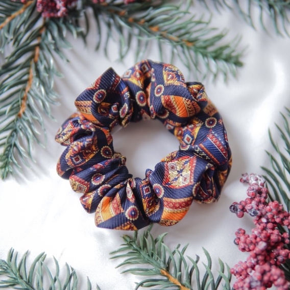 Wyjątkowa gumka do włosów typu scrunchie uszyta z wysokiej jakości jedwabnego krawata. Tkanina ozdobiona jest eleganckim, geometryczno-heraldycznym wzorem przypominającym królewskie kotyliony – pełnym barw, głębokiego granatu, złota i czerwieni.
