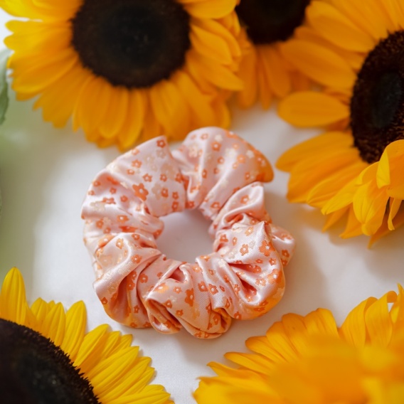 Jedwabna scrunchie z krawata w żakardowe pomarańczowe kwiatuszki. Delikatna dla włosów, ręcznie szyta, unikatowy upcycling.