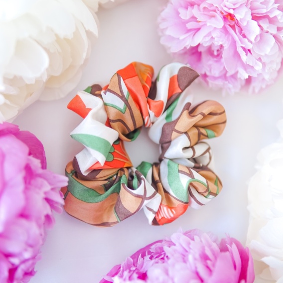 Ta scrunchie ma za sobą ciekawszą historię niż niejeden vintage-sklep: została uszyta z fragmentu jedwabnej sukienki, której wzór przywodzi na myśl malarską łąkę – ciepłe brązy ziemi, soczyste zielenie liści i świetliste plamy koralowej czerwieni. Zamieniając zapomniany element garderoby w nowy, funkcjonalny dodatek, redukujemy tekstylne odpady i nadajemy luksusowemu materiałowi drugie życie. Jedwabna satyna o delikatnym połysku sunie po włosach bez tarcia, dzięki czemu pasma nie łamią się i nie odgniatają.