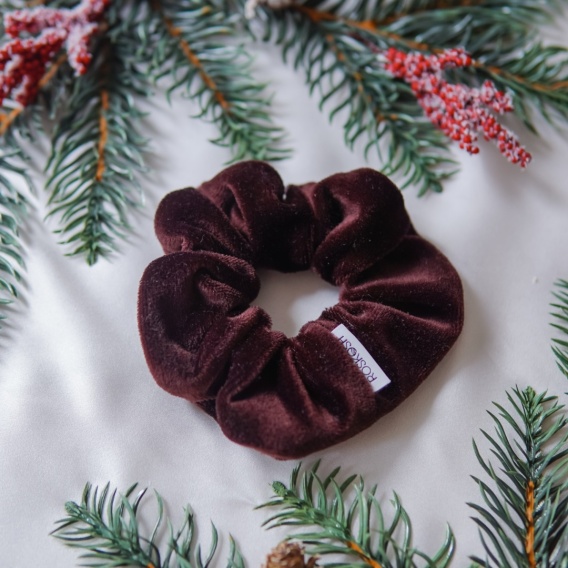 Mini scrunchie z miękkiego, czekoladowego weluru – klasyczny i elegancki dodatek do włosów i na rękę.