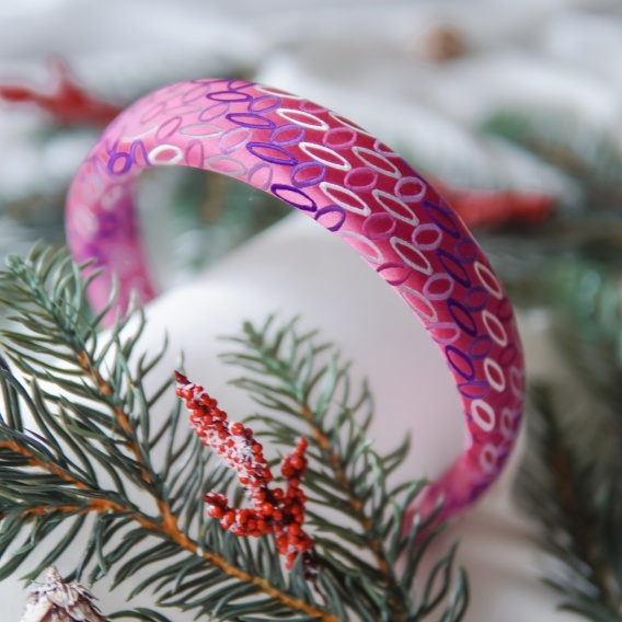 Unikatowa opaska do włosów wykonana z recyklingowanego jedwabnego krawata. Model „Oczka” wyróżnia się intensywnie różową kolorystyką i wzorem owalnych oczek w odcieniach bieli, fioletu i czerwieni. Ta efektowna i jednocześnie elegancka opaska stanowi idealny dodatek, który podkreśli Twoją osobowość i nada stylizacji kolorystycznego akcentu.