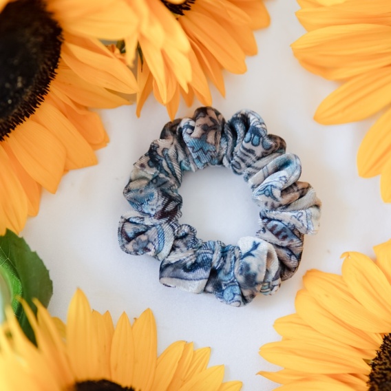 Mała gumka do włosów wykonana z niezwykle miękkiego i eleganckiego jedwabnego weluru z orientalnym wzorem. Połączenie głębokich odcieni niebieskiego, szarości i delikatnego wzoru inspirowanego motywami orientu nadaje jej unikalnego charakteru. Materiał jest przyjemny w dotyku, delikatnie sunie po włosach, nie ciągnie ich ani nie odgniata fryzury, co czyni gumkę idealnym wyborem dla osób z wrażliwą skórą głowy i delikatnymi pasmami. Jej mały rozmiar świetnie sprawdza się do cienkich włosów lub przy tworzeniu drobnych upięć.